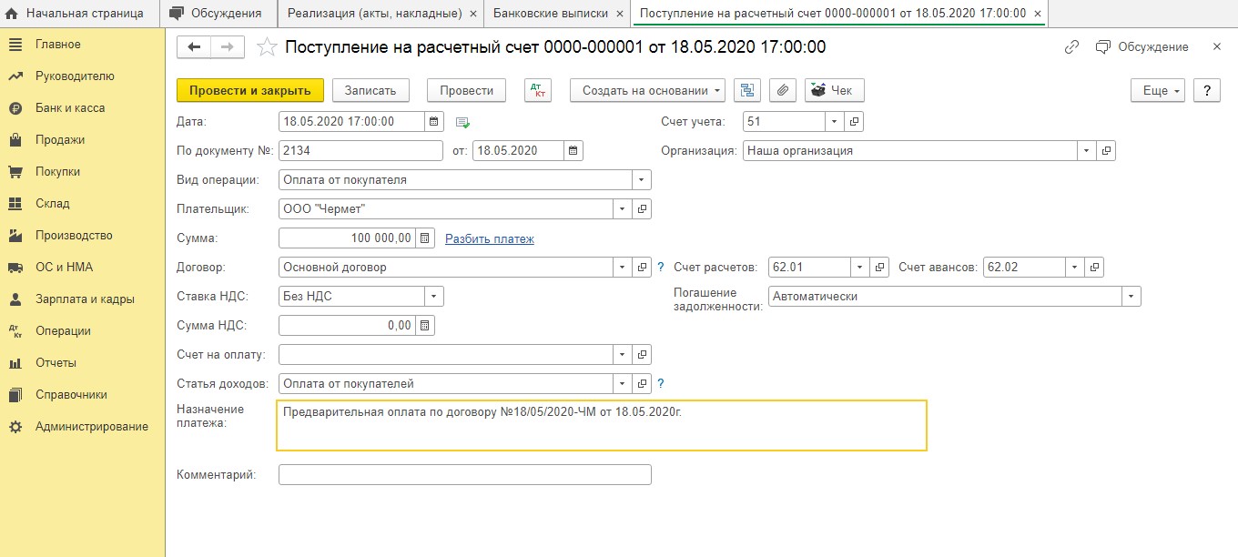То, что оплата была получена, нужно отразить определенным документом "Поступление на расчетный счет".