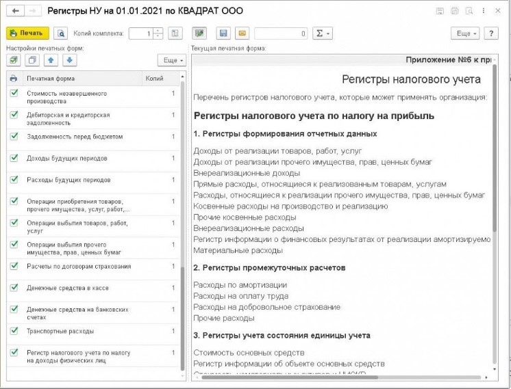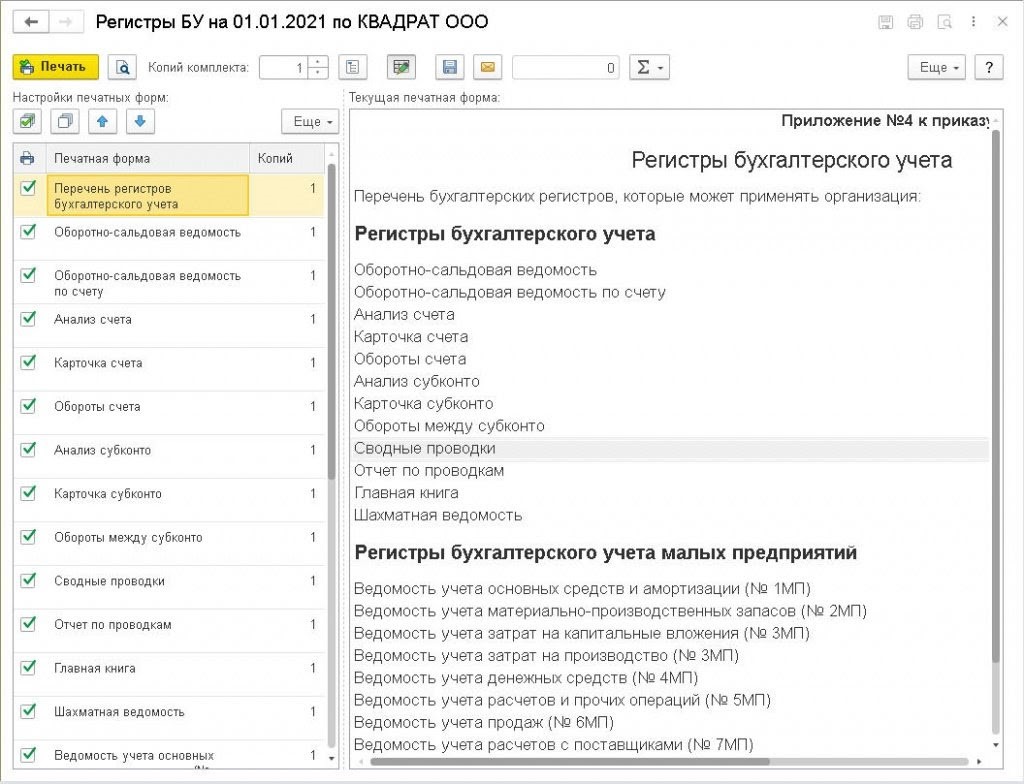 В данный список включены все первичные документы — как регламентированные законодательством (товарная накладная, кассовые ордера и др.), так и реализованные в 1С (справки-расчеты и пр.). Печатные формы документов, которые не установлены законодательством, имеют пометку в виде флажка в настройках печатных форм. Они в автоматическом режиме входят в Прил. № 3 при печати.