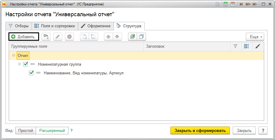 Чтобы наш отчет принял более компактный вид для удобного просмотра, снова перейдем в настройки на вкладке «Структура» и добавим поля для группировки в разрезе номенклатурной группы. Таким образом первым полем у нас будет номенклатурная группа, а все данные будут разворачиваться по каждой группе.
