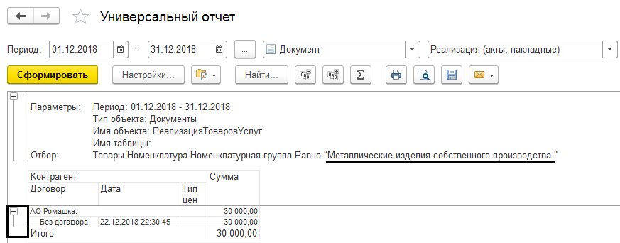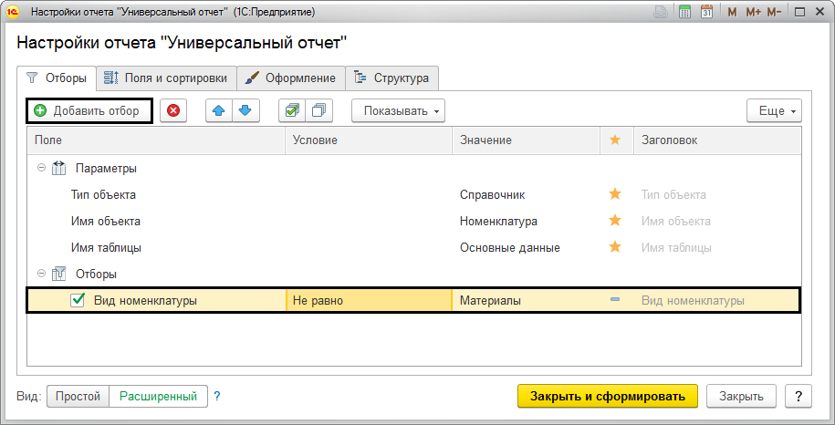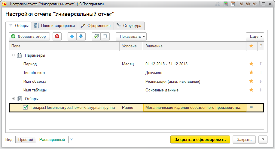 Данный отчет может напомнить один из стандартных отчетов «Оборотно-сальдовая ведомость по счету», который может отображает такую информацию. Но ключевая особенность «Универсального отчета» в его способности показывать данные, которые не найти и не сформировать в стандартных отчетах 1С:Предприятие. Например, если необходимо отобрать лишь данные по конкретной номенклатурной группе «Металлические изделия собственного производства», из всего объёма реализованной продукции. Чтобы это реализовать, необходимо нажать на кнопку «Настройки...» и на закладке «Отборы», воспользовавшись кнопкой «Добавить отбор», сделаем «Товары.Номенклатура.Номенклатурная группа» по условию равным «Металлические изделия собственного производства». Чтобы применить настройки нажимаем «Закрыть и сформировать».