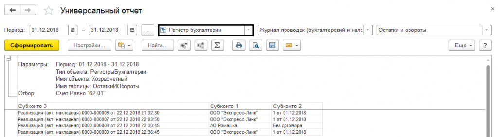 Отчеты по регистрам, которые выбрали, сформируются по умолчанию и не требуют настройки. Для регистра бухгалтерии настройка выглядит следующим образом: