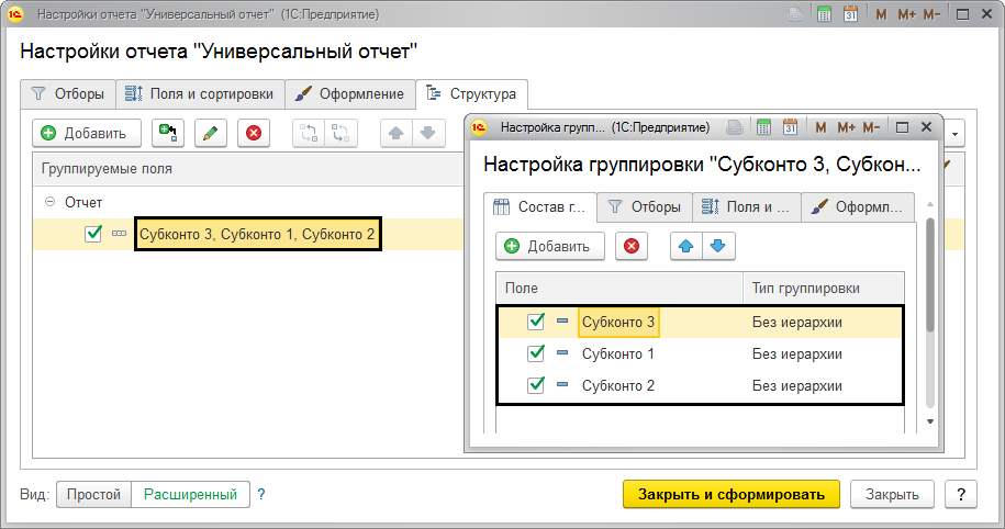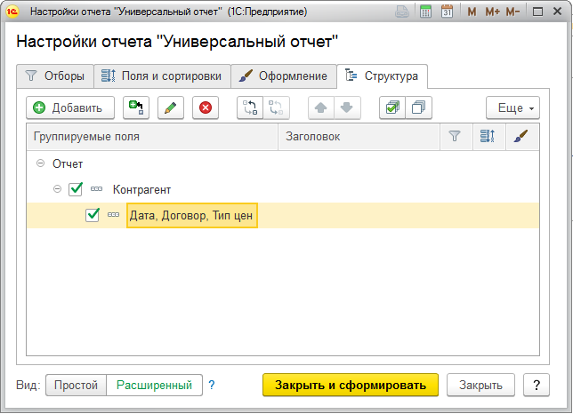 Таким образом, мы используем различные отборы для формирования нужных данных с помощью «Универсального отчета». В нашем отчете не так много информации, но при больших объёмах информации «Универсальный отчет» ещё позволяет задавать структуру отчета, для группировки данных по какому-либо признаку. Например, в отчете требуется сгруппировать данные по всем контрагентам, по месяцам. Заходим снова в настройки отчета и переходим на вкладку «Структура». На неё задаем группировку по полю «Контрагент» и дополнительную структуру данных под ней, например: Дата, Договор и Тип цен. Снова формируем отчет кнопкой нажатием на «Закрыть и сформировать».