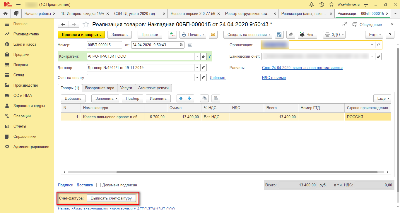 2. Сформированный на основе первого документа счет-фактура. Фактурная часть в бумажном документе будет выделена рамкой.
