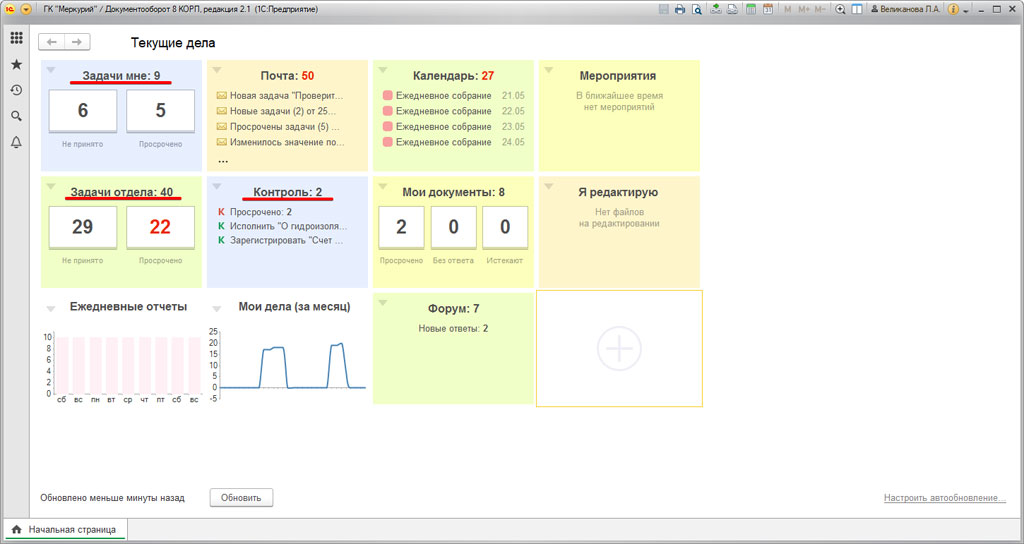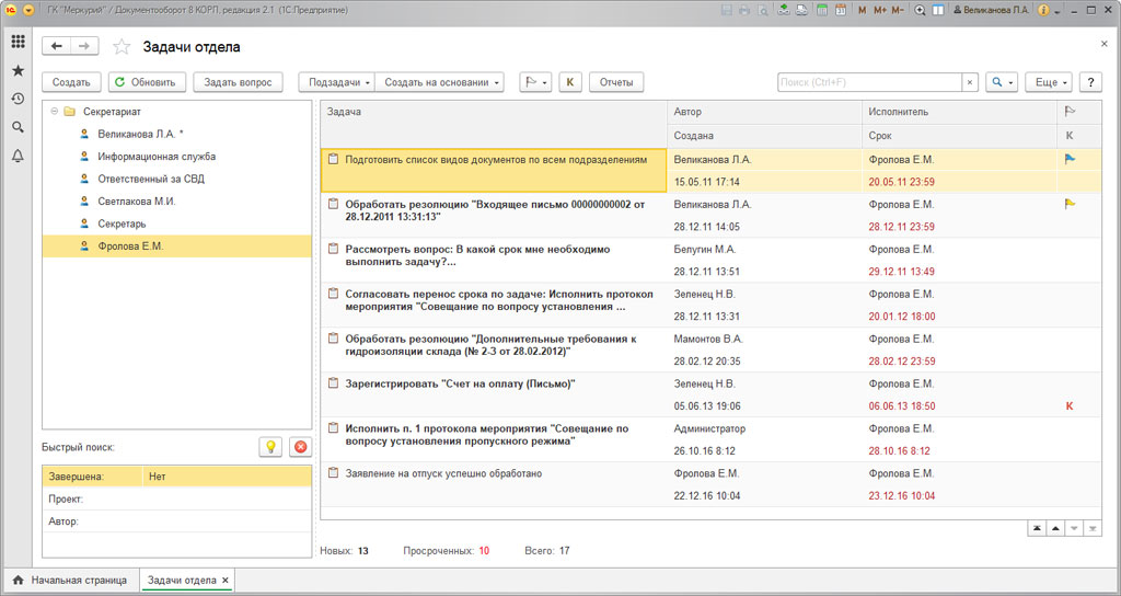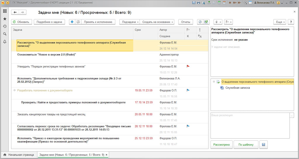 У 1С:Документооборот имеются мощные инструменты, которые позволяют управлять задачами и обеспечивать четкий контроль их выполнения. Система дает возможность фиксировать сроки исполнения даже в случае, если имело место перенаправление.