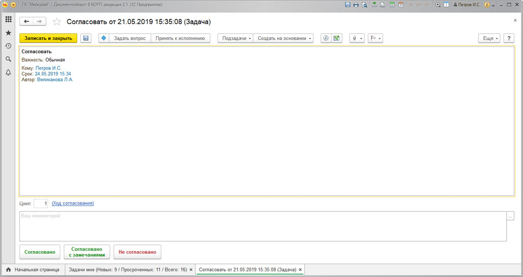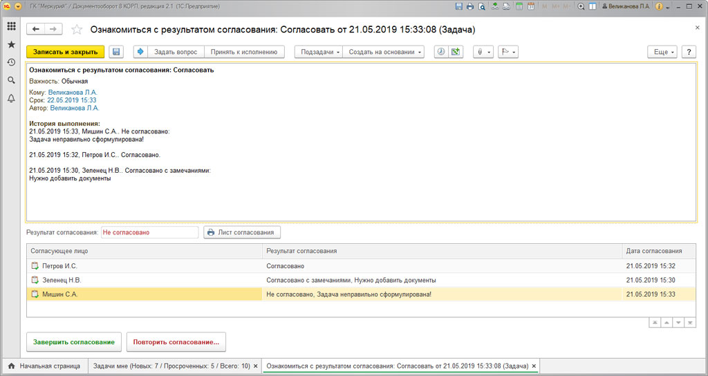 В случае, если вынесено решение "Не согласовано", то задача отправляется на доработку. После ее завершения можно запустить повторный цикл согласования. Если замечания невозможно устранить, то процесс завершается.