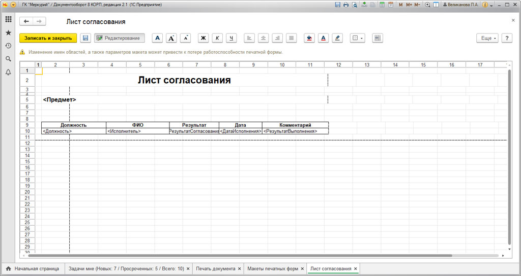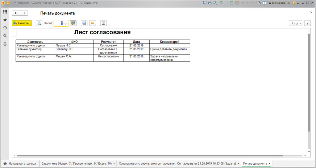 После согласования создается печатная форма. На нее наносятся визы согласующих, комментарии и дата.
