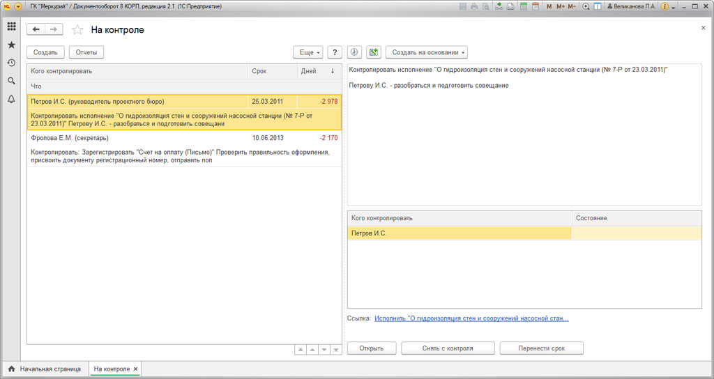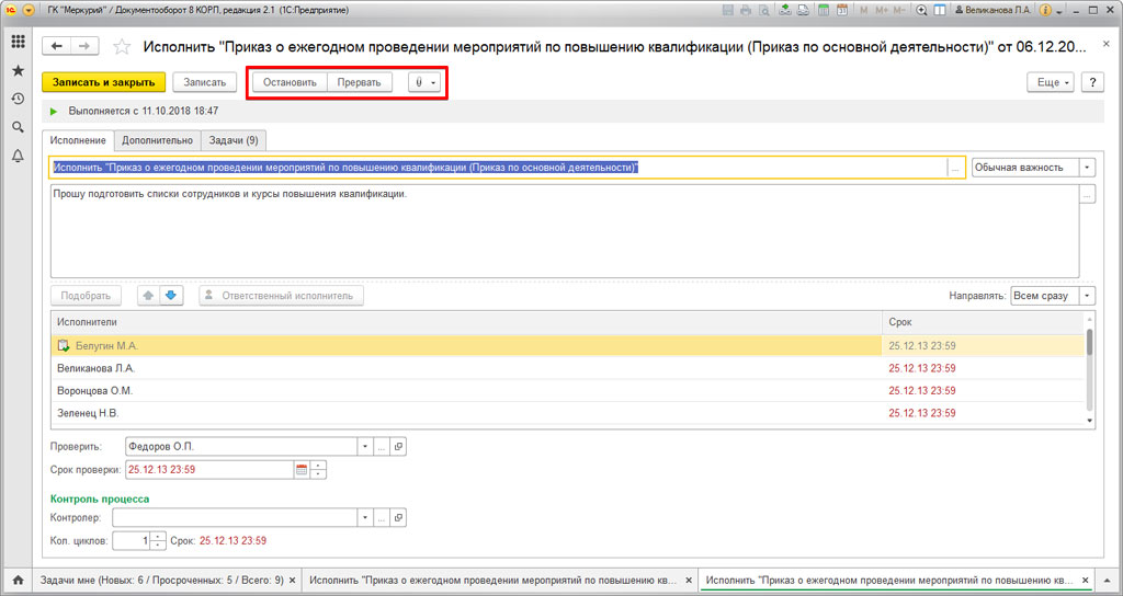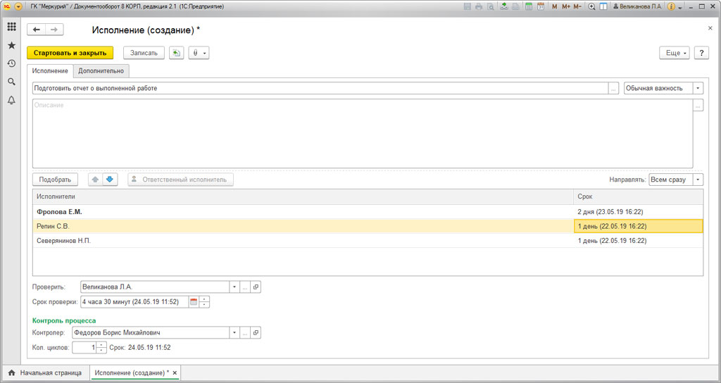 - исполнение поручений одному сотруднику или группе коллег, для этого настраиваются контроль, порядок проверки;