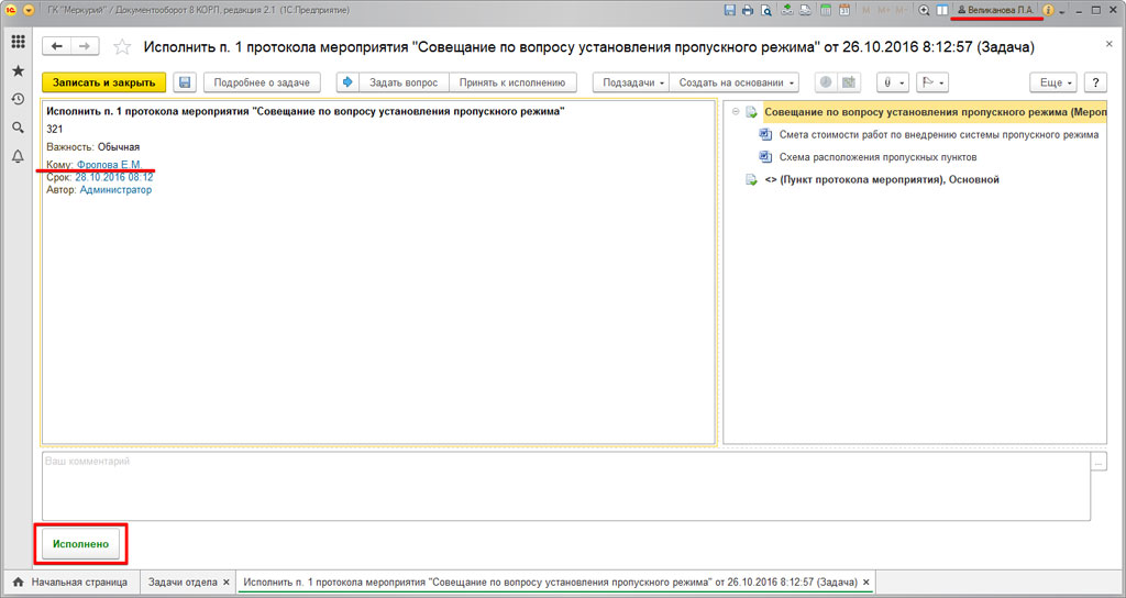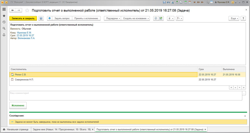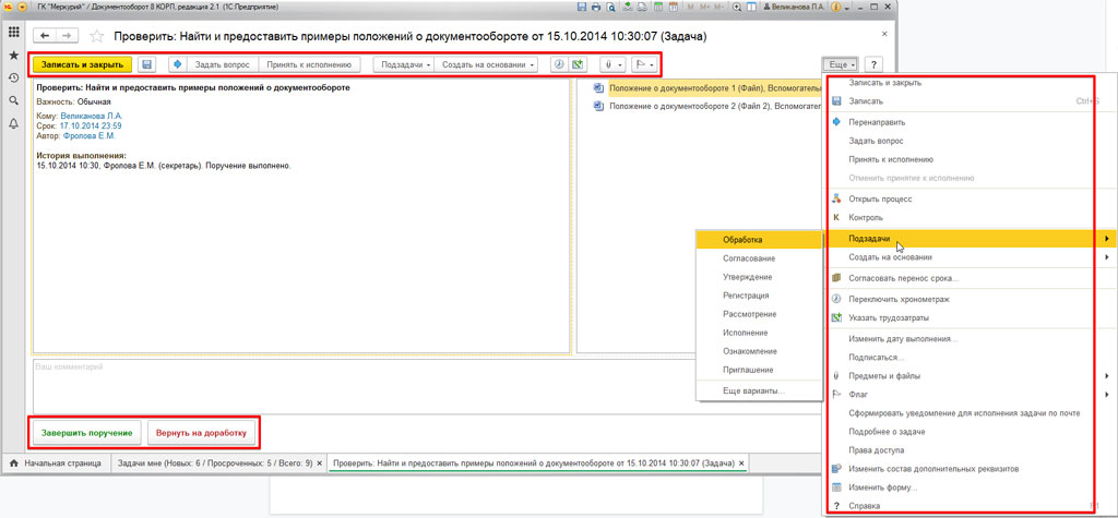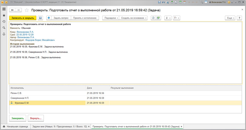 При составлении поручения часто выбирается проверяющий. Когда все исполнители заканчивают свои задачи, ему приходит сообщение с требованием осуществить проверку. При необходимости он просит сотрудников осуществить доработку.