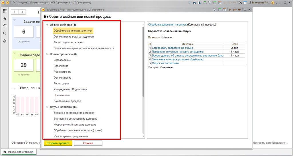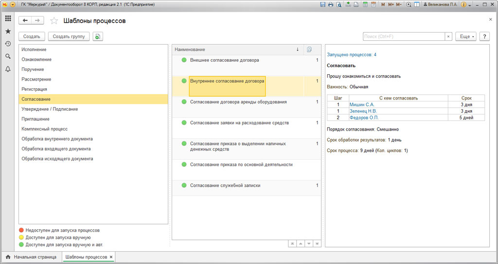 Процессы в системе представляют собой ранее настроенные схемы: от начала и до завершения. Во время этого движения выставляются различные задачи: утвердить, исполнить, согласовать. Разработчики заложили следующие типовые процессы: