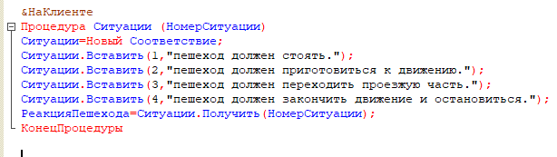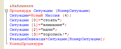 3. «Команда «Стой» – мы задаем номер ситуации и запускаем процедуру получения данных из массива НомерСитуации=0;Ситуации(НомерСитуации);