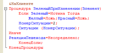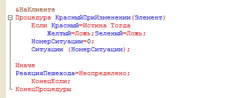 4. Логическое выражение не может закончился без команды Иначе, поскольку процедура должна выполнить какое-либо действие и в том случае, когда условия не выполнены. Иначе РеакцияПешехода=Неопределено; КонецЕсли; КонецПроцедуры.
