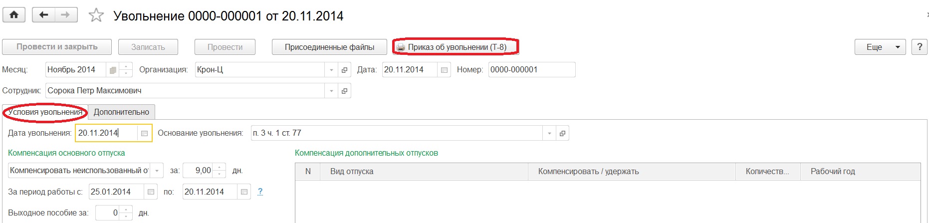 К примеру, сотрудник кадрового отдела пользуется настроенным под его задачи интерфейсом. В этом случае после открытия рассматриваемого документа доступными станут только две вкладки. В них кадровик указывает дату и причину прекращения трудовых отношений. О необходимости удержания или компенсации он может поставить лишь отметку. Как только заполненный документ будет проведен, можно распечатывать официальный приказ об увольнении.