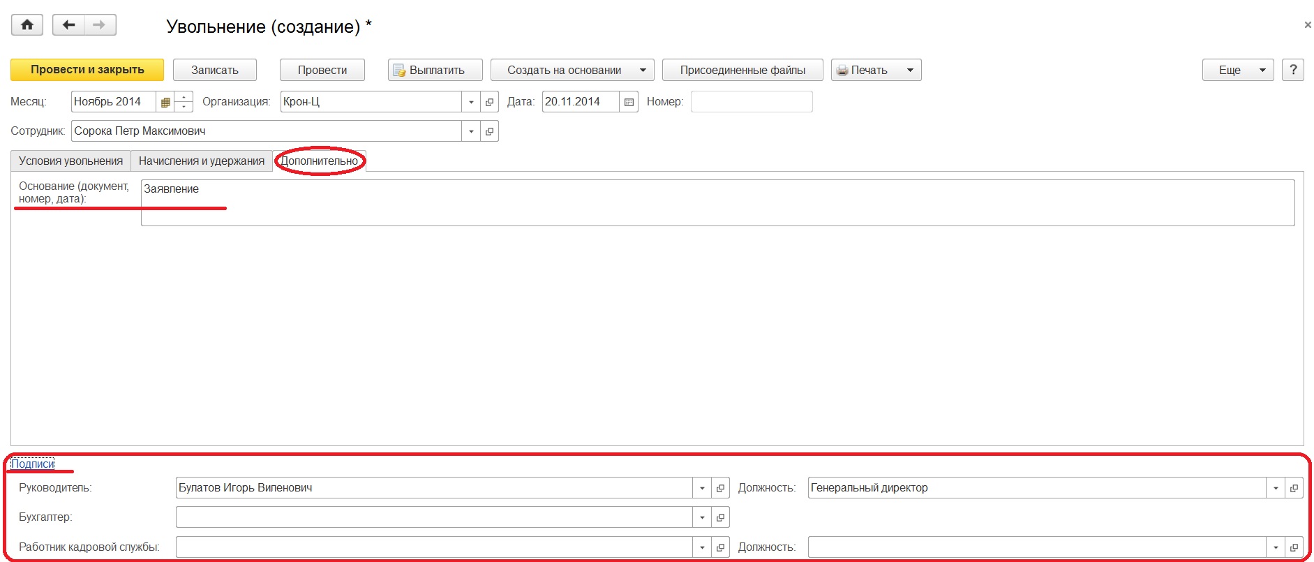 Заключительная вкладка в данном документе называется «Дополнительно». На ней указывается документ, ставший основанием для увольнения работника. Это отражается на печатном носителе приказа об увольнении. Как и сведения о руководящем лице и прочих сотрудниках, несущих ответственность, в записке-расчете, данные дополнения должны быть заполнены в разделе подписи по гиперссылке с одноименным названием.