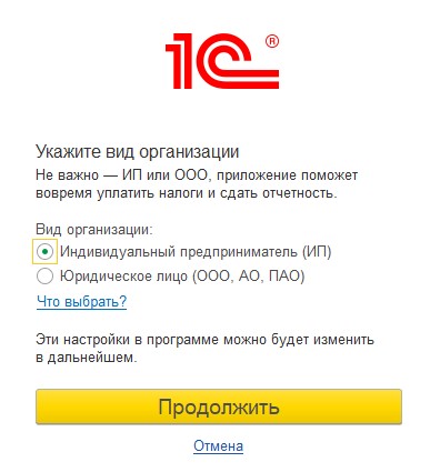 Рассмотрим, как начать вести учет бизнесмену, использующему ПСН в 1С: Бухгалтерия ред. 3.0.При первом включении программы, вам потребуется выбрать тип организации. В связи с тем, что в этой статье мы рассматриваем патентную систему, а её могут использовать лишь индивидуальные предприниматели, то выбор стоит сделать в пользу ИП.