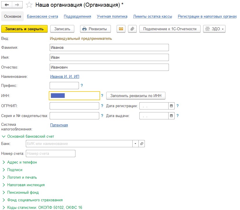 Так же, если в программе 1С ранее уже велась деятельность других организаций и у вас есть необходимость включить нового предпринимателя на патенте с помощью справочника.