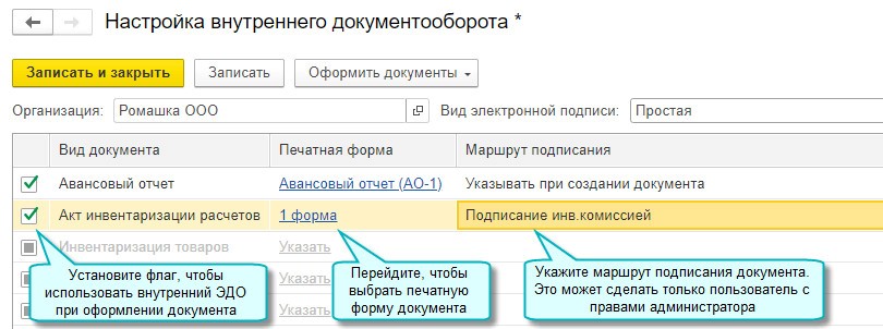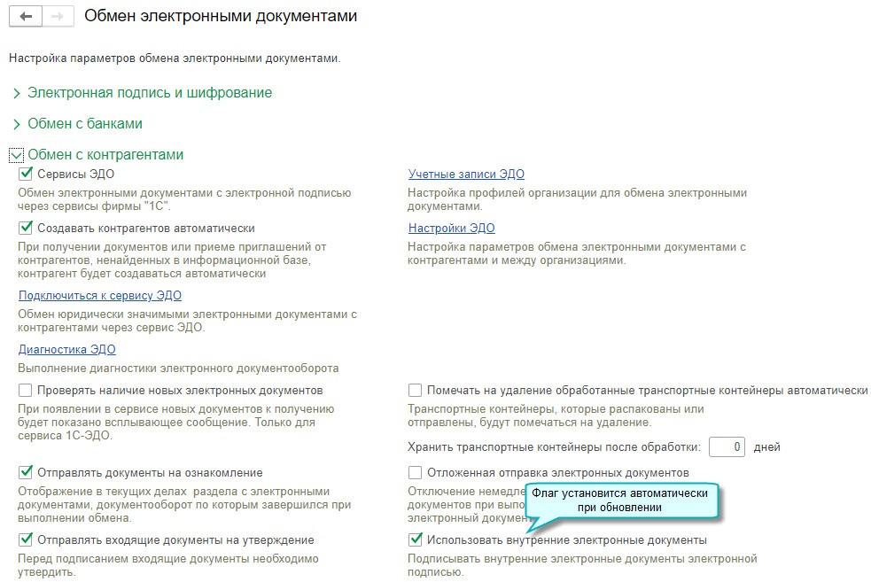 Кроме того, настроить внутренний оборот электронных документов для их разных видов можно, используя общие настройки ЭДО.