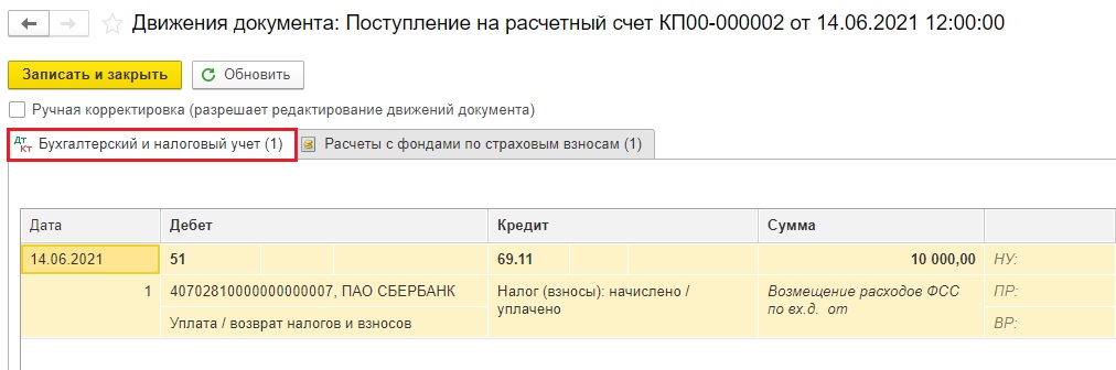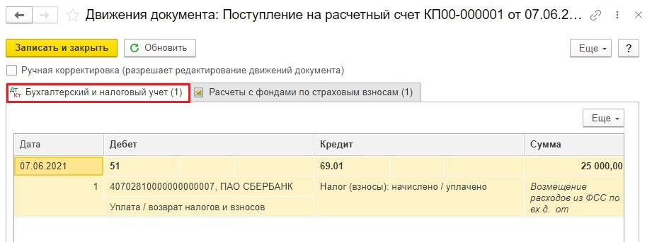 Шаг 3. В результате сформируется проводка: Дт 51 - Кт 69.01.