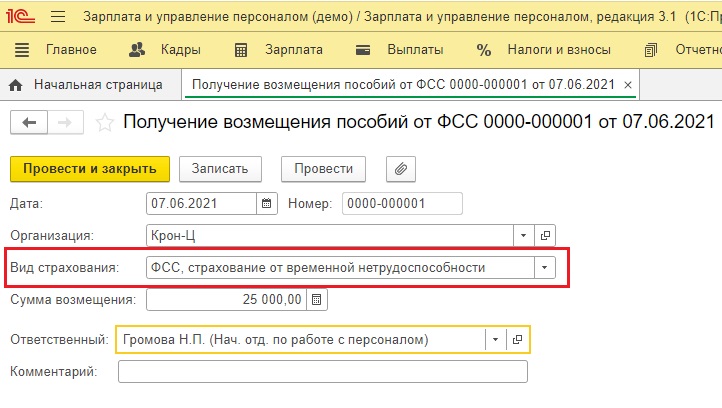 Отражение регистрации возмещения расходов ФСС в программе 1С: Зарплата и управление персоналом, ред. 3.1