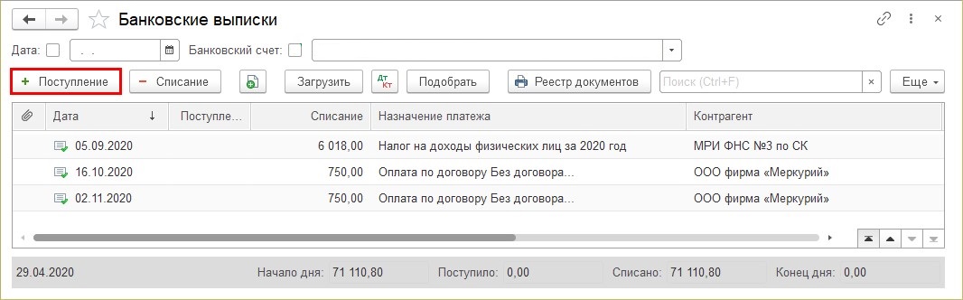 Шаг 1. Перейдите в журнал «Банковские выписки» и нажмите кнопку «Поступление».