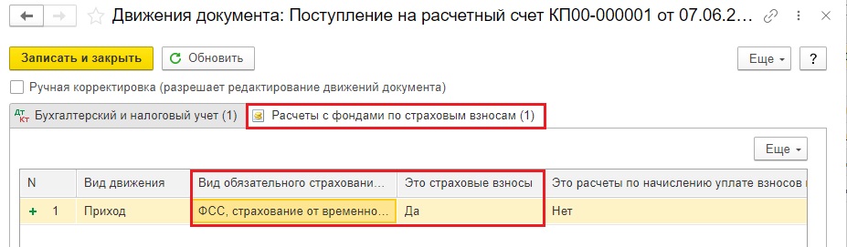 В документе задействован регистр накопления «Расчёты с фондами по страховым взносам».