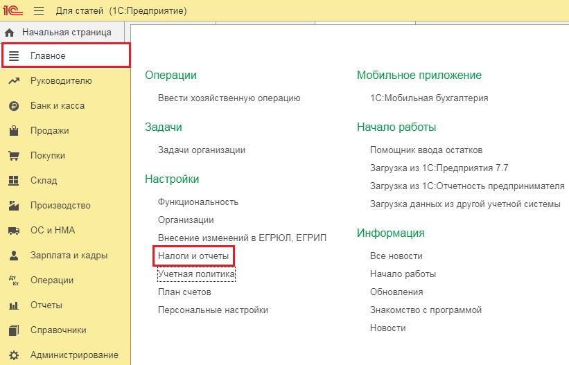 Чтобы данные налогового и бухгалтерского учета совпадали, выберем графу «Налоги и отчеты» в главном разделе.