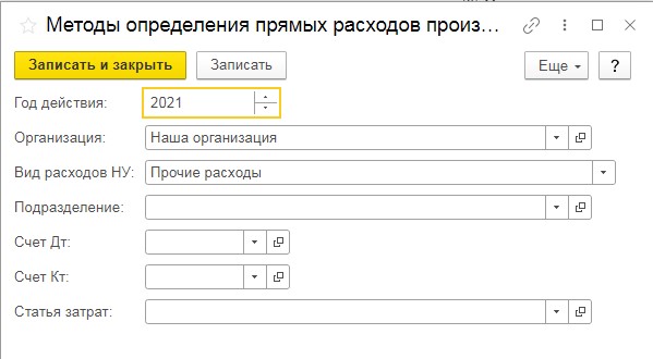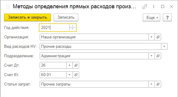 Добавляем указание, что затраты с видом расходов в налоговом учете в графе «Прочие затраты» являются прямыми. Эта настройка будет выглядеть так: