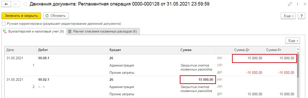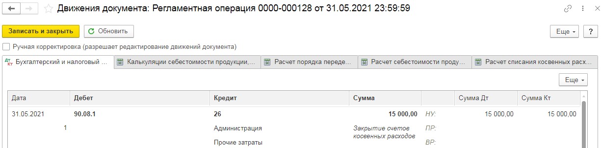 Проведем еще раз закрытие месяца и посмотрим проводки.