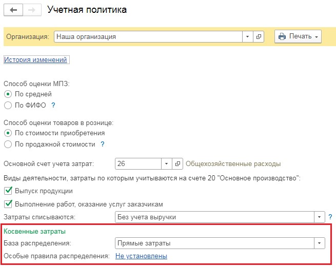 Рассмотрим небольшой пример. Установим в пункте учетной политики в качестве базы распределения косвенных затрат счета 25 оплату труда. Особые правила распределения учитывать не будем.