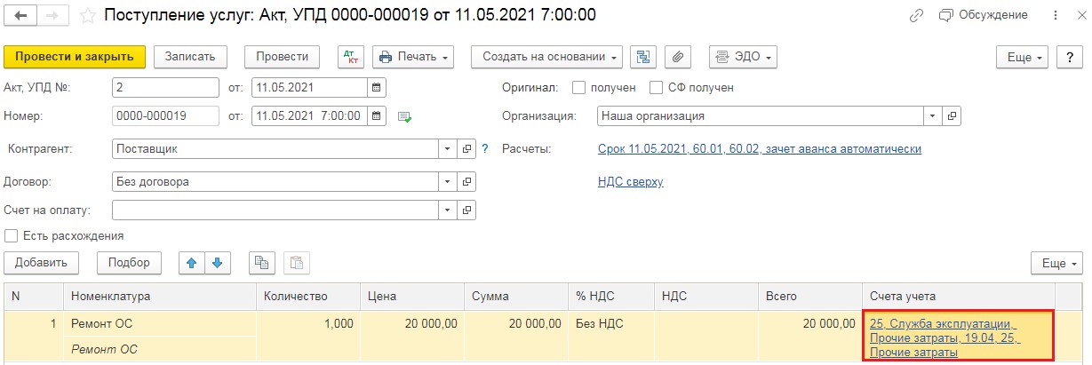 В открывшийся документ вводим все необходимые данные из акта. Заносим в таблицу услугу «Ремонт ОС» и относим ее на 25 счет. Проводим новый документ.
