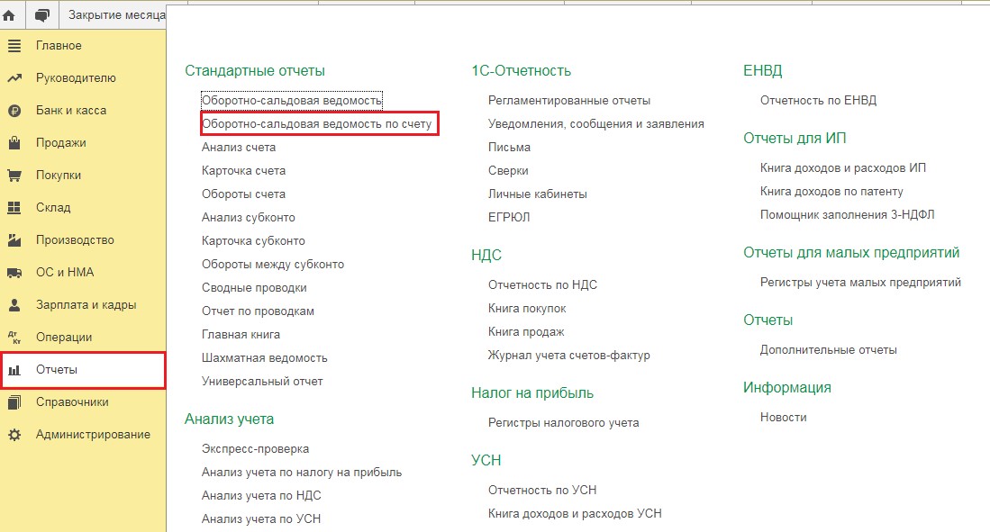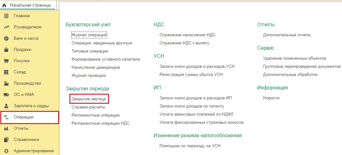Выберем раздел «Операции» и пункт «Закрытие месяца».