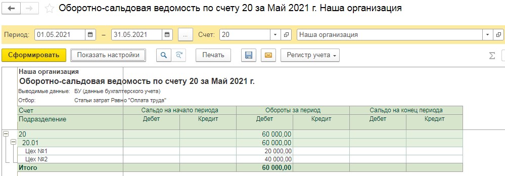В появившемся отчете устанавливаем период и выбираем счет 20, нажимаем «Настройки». В разделе «Группировка» ставим «Подразделение», на вкладке «Отбор» отмечаем «Статьи затрат – равно – Оплата труда» и создаем отчет.