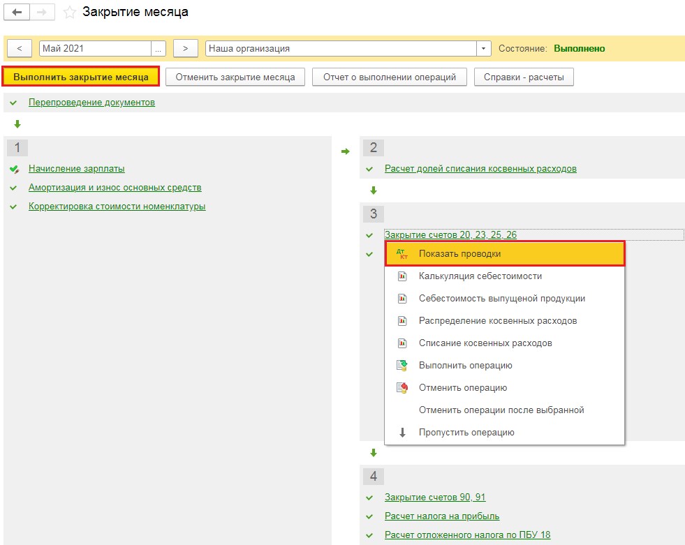 В появившемся окошке выберем необходимый месяц и нажмем «Выполнить закрытие месяца». После обработки данных всех пунктов шрифт поменяет цвет и станет зеленым. Нажимаем «Закрытие счетов 20,23,25,26», и в открывшемся окне выбираем «Показать проводки».