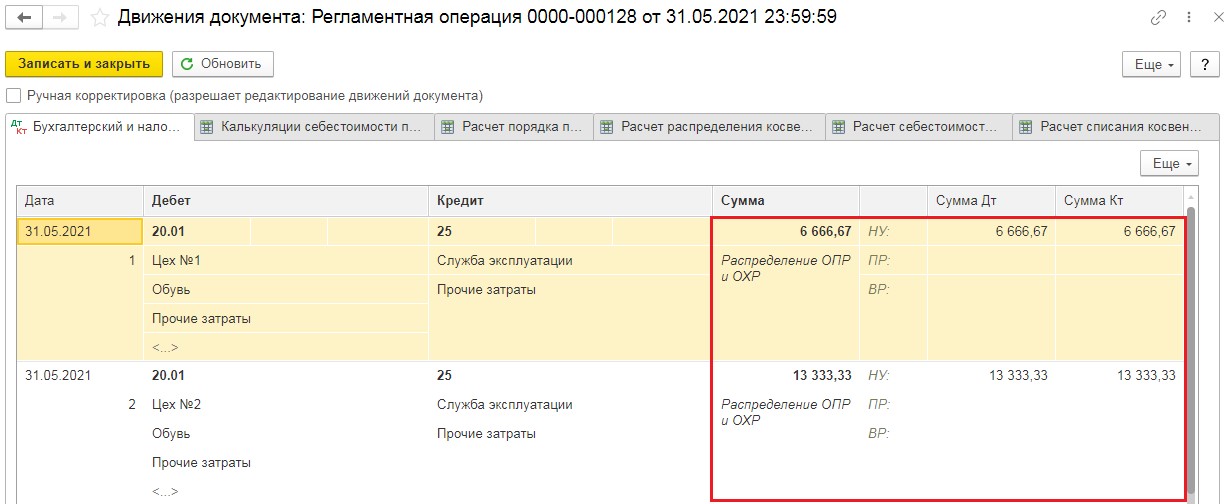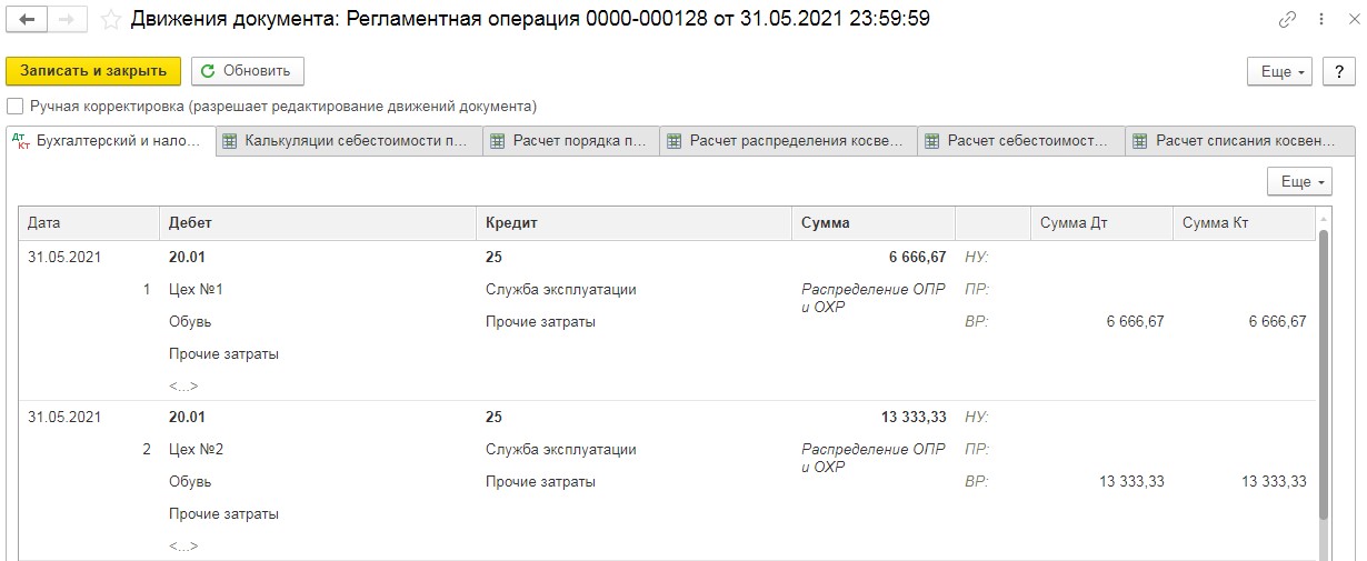 Здесь мы видим, что затраты на 25 счете (в нашем случае 20000 рублей) распределились по подразделениям в пропорциях начисленной заработной платы. Это легко проконтролировать, разделив 20000 рублей на три, для получения суммы цеху №1, затем умножить на 2/3 для определения суммы цеху №2.