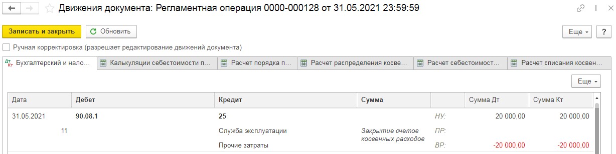 Еще раз проведем закрытие месяца и рассмотрим проводки в операции «Закрытие счетов 20,23,25,26»