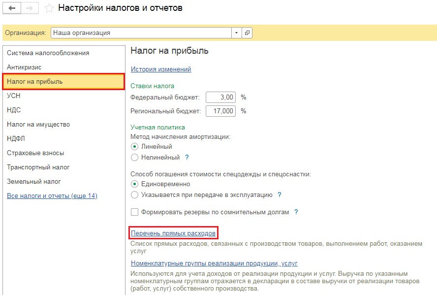 Откроем вкладку «Налог на прибыль» и перейдем в «Перечень прямых расходов».
