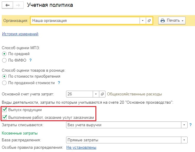 Внимание! Настройка необходима лишь в случае прямых затрат. В этом случае рекомендуется такие затраты относить на 25 счет. Но в качестве примера разберем такую настройку.