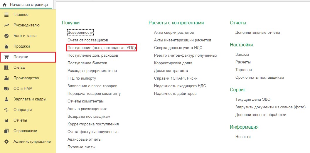 Вводим затраты на 25 счет, для чего открываем раздел «Покупки» и выбираем пункт «Поступление (акты, накладные, УПД)». Нажимаем кнопку «Поступление» и выбираем «Услуги (акт, УПД)».