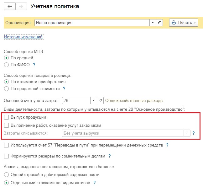 Но не нужно забывать, что есть организации, работающие без выпуска продукции и не оказывающие никаких услуг. Для них настройка данных учетной политики будет производиться без пунктов «Выпуск продукции» и «Выполнение работ, оказание услуг заказчикам».