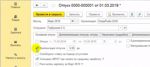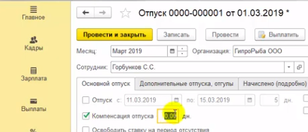 В программе "1С:Зарплата и управление персоналом 8.3" назначить замену отпуска денежной компенсацией можно в документе отпуск.